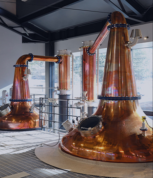 富嶽蒸溜所のこだわりとして、初溜に直火加熱方式を採用しています。直火を用いることによりもろみがトーストされ、香ばしく力強い香りのニューポットを生み出します。