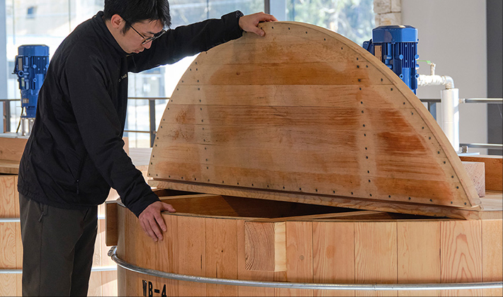 木製の発酵槽により、酵母菌や乳酸菌による複雑な発酵を実現し、より独創的なもろみを生み出します。